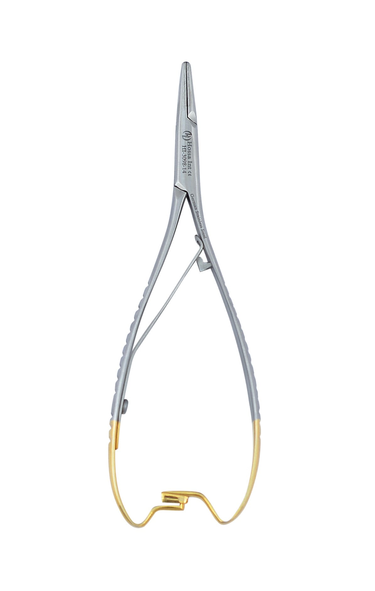 Mathieu Vascular (vascular) tc gold needle holder called a vice for gripping and guiding the needle during surgical sewing. The vice is used by the surgeon not only to hold the needle during suturing, but also to tie the ends of surgical threads on the tool. Mathieu is one of the most popular instruments for surgical suturing due to its optimal and lightweight construction. It is ideally suited for sutures, i.e. a method of dressing wounds that require frequent repositioning . The shape and size of the vice adapts to the type of tissue being sewn and the surgical threads being used. Used, among others, in: general and dental surgery, endodontics, orthodontics, veterinary medicine. Due to the arc-shaped construction of the handle and internally hidden gears, the needle holder is characterized by comfort of use, e.g. it does not pull protective gloves on the lock.
